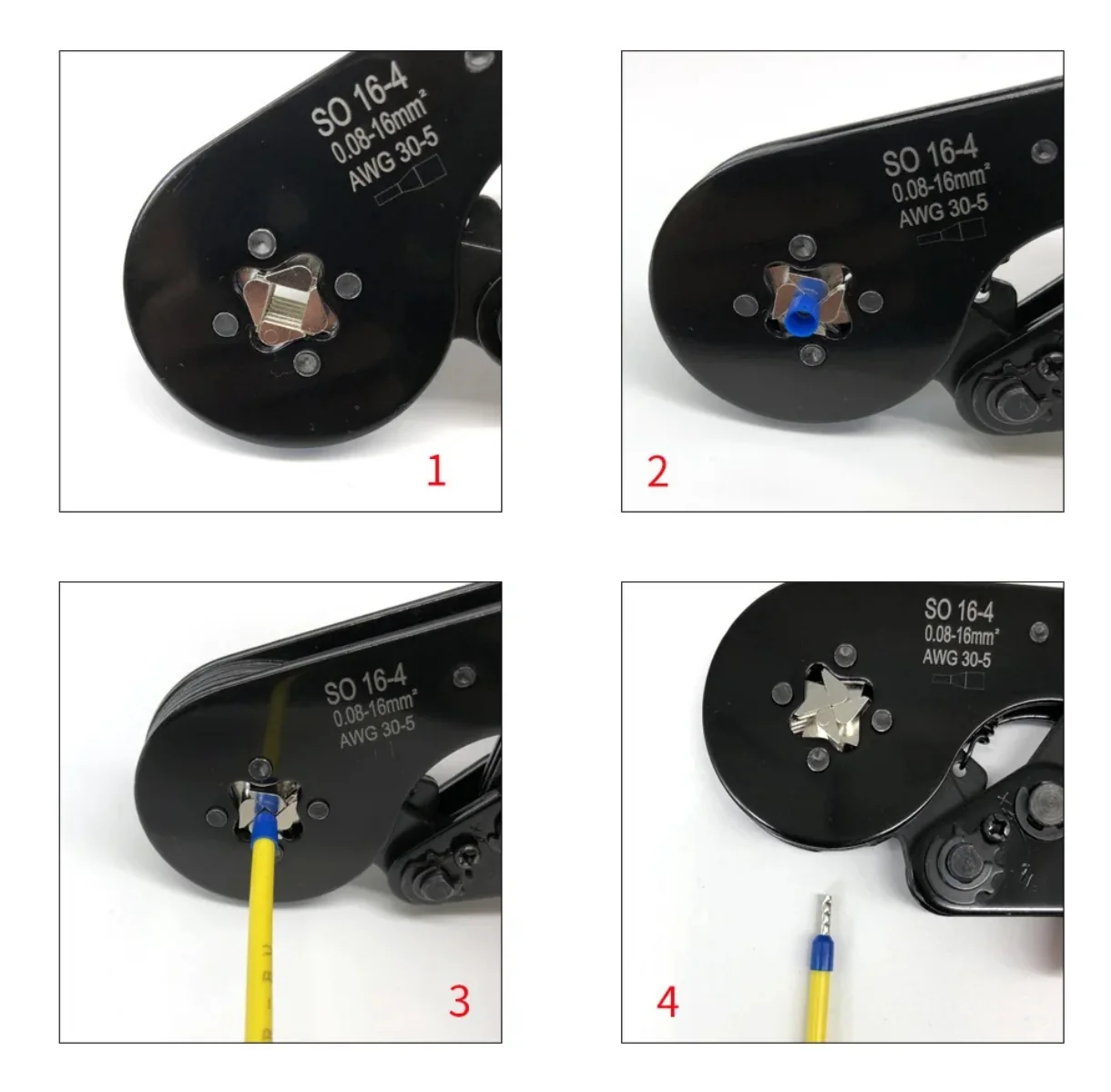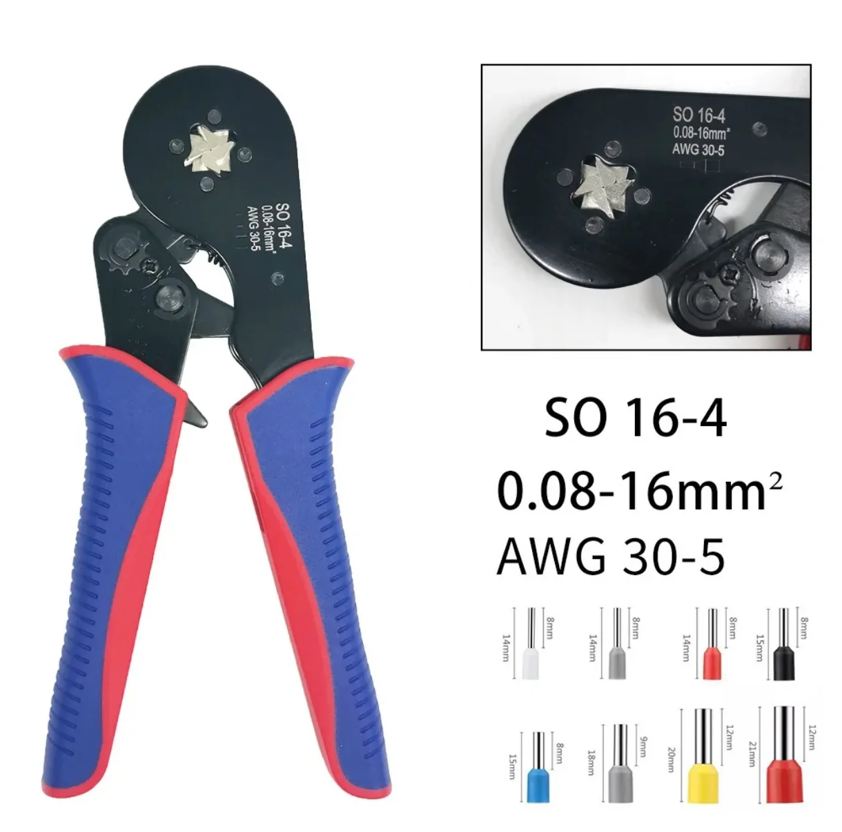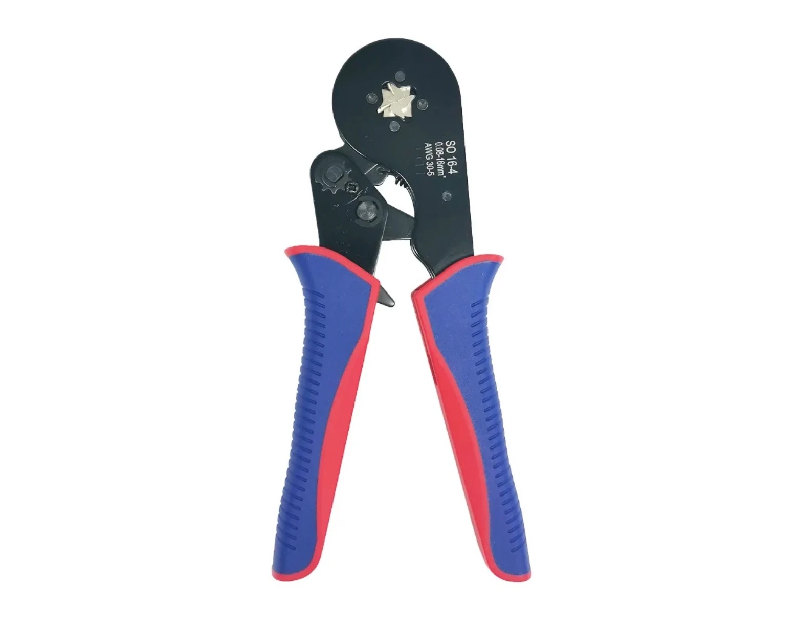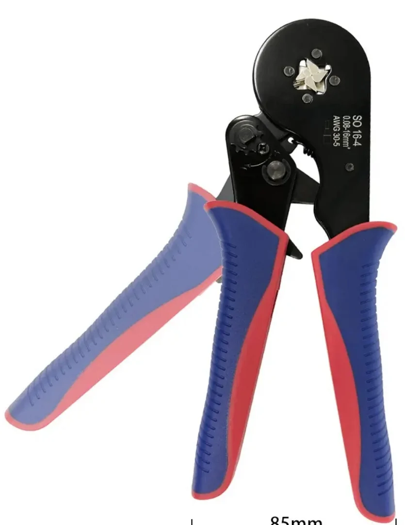 Esta es la pinza de crimpeado autoajustable SO16-4/16-6. Es adecuada para terminales tubulares desnudos y terminales preaislados sin soldadura que cumplen con las normas de conexión eléctrica estándar.